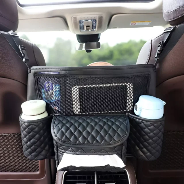 Say goodbye to messy car interiors with this universal leather car seat organizer. Designed to hang conveniently between the front seats, this smart storage bag gives you easy access to your handbag, tissues, drinks, and other small items while keeping your car tidy and clutter-free. Made from premium PU leather, it adds a touch of elegance to your vehicle while being durable and easy to clean.